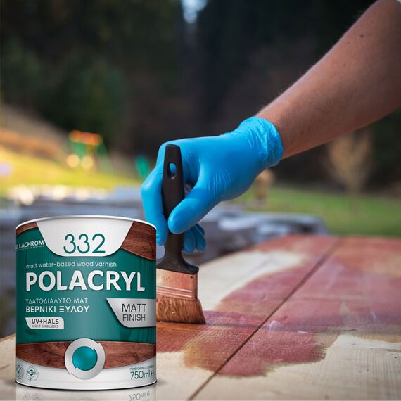 Το POLACRYL 332 είναι υψηλής ποιότητας υδατοδιαλυτό ματ βερνίκι ακρυλικής βάσης. Είναι άοσμο, ιδανικό προϊόν για εσωτερική και εξωτερική χρήση. Δημιουργεί ένα όμορφο ματ φινίρισμα, αναδεικνύοντας τη φυσική ομορφιά του ξύλου. Εφαρμόζεται σε πόρτες, παράθυρα, κουφώματα, ξυλεπενδύσεις, πέργκολες και κάθε ξύλινη επιφάνεια. Είναι υδατοαπωθητικό, έχει μεγάλη ελαστικότητα και δεν ξεφλουδίζει, φουσκώνει ή σπάζει. Προσφέρει εξαιρετικές αντοχές στη χάραξη. Παρέχει ισχυρή προστασία από την καταστροφική δράση της υπεριώδους ακτινοβολίας, τη βροχή και την υγρασία.